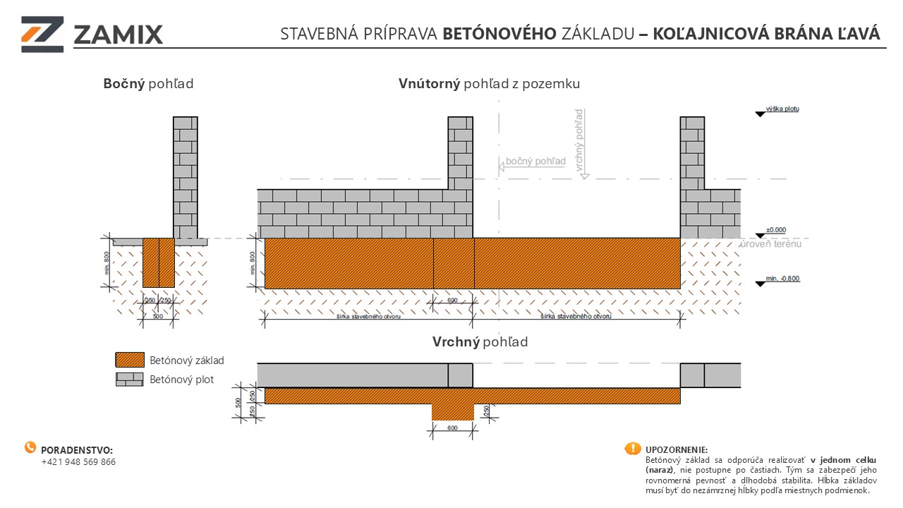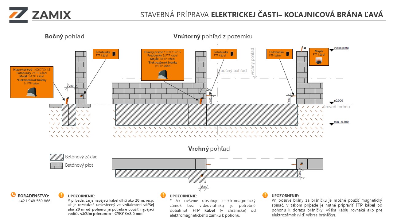 Aby montáž koľajnicovej brány prebehla presne a bez dodatočných úprav, je potrebné pripraviť betónový základ a kabeláž podľa technických požiadaviek nižšie.